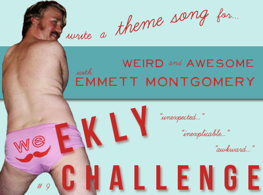 When I found out Emmett Montgomery had asked us to write some theme songs for his new show “Weird and Awesome with Emmett Montgomery” I knew this was going to be a good week. Emmett is one of the funniest people I know and I’ve always had a good time when we’ve done shows with him. I mean this guy posed in WE panties with us!! How do you beat that!!!? I also know Emmett rolls with some pretty funny people so that was good inspiration as well.